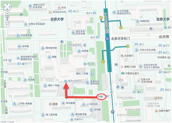 建议嘉宾由北京大学“东南门”入校,向西直行50米,右侧即为“北京大学英杰交流中心”。开车入校,须提前报备车牌号。