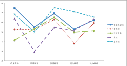 数据显示,“五通”情况呈明显的区域特征。该指数按东南亚、南亚、西亚北非、中东欧、中亚蒙古等五大区域划分,东南亚整体得分较高,其贸易畅通、资金融通和民心相通得分均排名第一;中亚蒙古在政策沟通和设施联通方面排名第一;南亚以及中东欧各国“五通”整体相对落后。总体而言,“一带一路”沿线国家“五通”发展程度不均衡,整体有较大发展空间。