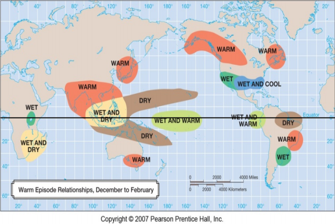从图1可以看出El Niño主要影响的区域包括南美洲、东南亚、印度、澳洲和美国等地。El Niño造成的负面影响主要有暴雨洪水、干旱林火、强热带气旋、珊瑚礁破坏、鸟类死亡等。此外,El Niño对全球气候的影响还有明显的季节性,通常在冬季的影响更大。