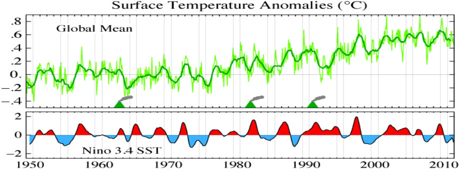 从图2可以看出,El Niño的出现和全球温度上升有很好的对应关系。因此,在当前全球变暖的大背景下,El Niño对全球气候和社会经济生活的影响将会进一步加剧。