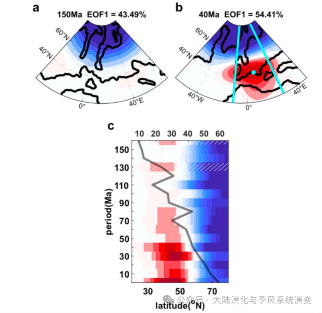 基于自1.6亿年前(160 Ma)以来的一系列时间切片模拟试验,在北美洲与欧洲仍相连时,大气变率的主要模态表现为极地地区的气压震荡,而中纬度地区尚未形成明显的反向气压振荡中心(图1a)。至8000万 - 6000万年前,当北大西洋扩张至约40个经度时,NAO模态开始出现(图1b)。随着北大西洋的持续扩张,NAO的南北偶极子振荡模态逐步增强,最终演化为现代海陆分布下的NAO模式(图1c)。系列理想模拟试验结果也表明,当洋盆宽度达到40个经度时,NAO开始出现,说明洋盆宽度是决定NAO形成的关键因子。