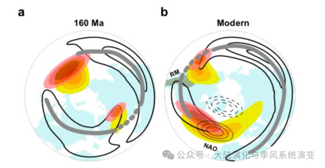 为什么NAO在洋盆宽度足够宽时才能形成? 这是因为北大西洋的展宽增强了海陆热力对比。尤其在在北半球中高纬度冬季,由于海洋的热容量远大于陆地,海表及其上空的大气温度显著高于陆地及其上空大气温度。这种纬向热力对比激发了大气定常波动,塑造了区域化的大气环流形态,包括北太平洋和北大西洋的高压系统、急流和风暴轴。随着北大西洋的持续扩张,该区域的海陆热力对比进一步增强,导致北半球冬季环流格局发生显著变化(图2),具体表现为:北大西洋西风急流西移,为天气尺度波的能量耗散提供了空间,北大西洋高压和风暴轴增强,加强了该区域的波流相互作用, NAO型振幅逐渐加强,并最终成为主导的大气振荡模态。模拟结果还表明,自4000万年前(40 Ma)以来,落基山脉的隆升通过激发地形定常波动,进一步强化了NAO振幅。