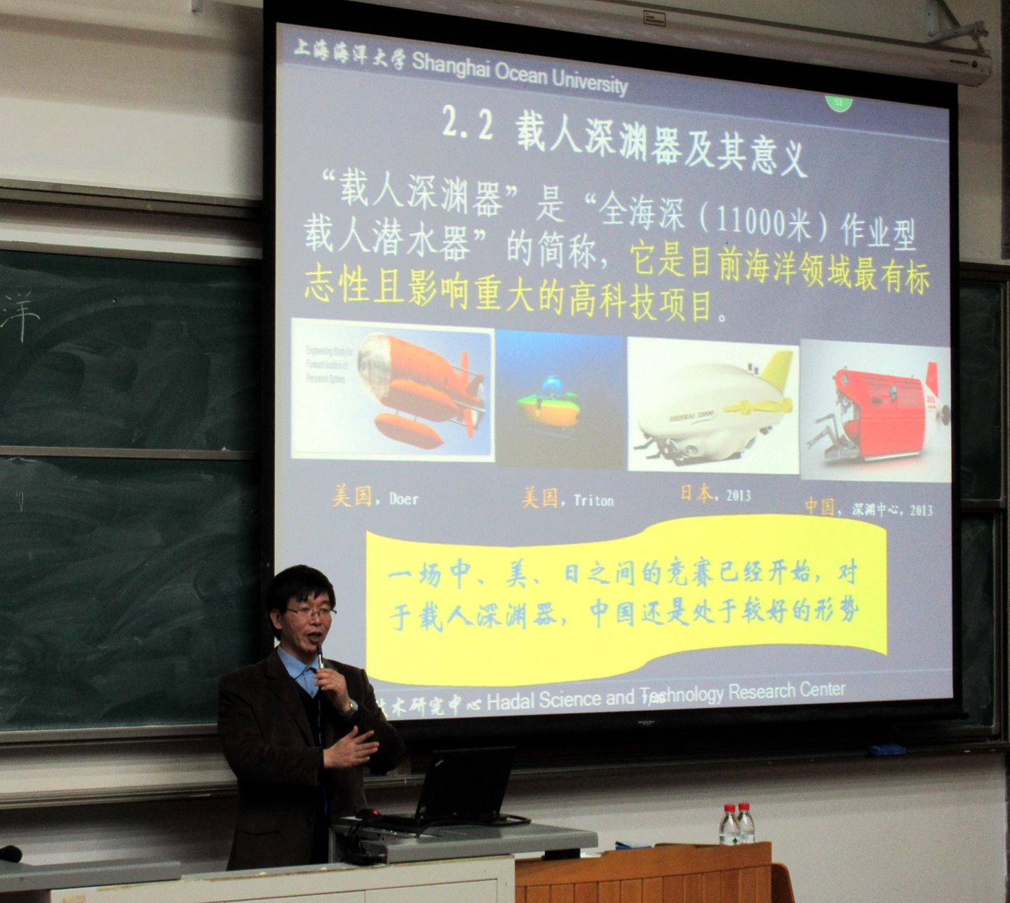 崔维成教授介绍了“蛟龙号”项目目前取得的成就及改进之处,并对我国载人深渊器项目发展策略以及载人深渊器研制过程中需要解决的关键技术问题进行了具体生动的讲解。作为第一副总设计师的崔维成教授,不仅担负着“蛟龙”号载人潜水器的设计研制工作,而且每次深潜海试,他都是第一批下潜的试潜员,被师生们认定为当之无愧的“深潜英雄” 。