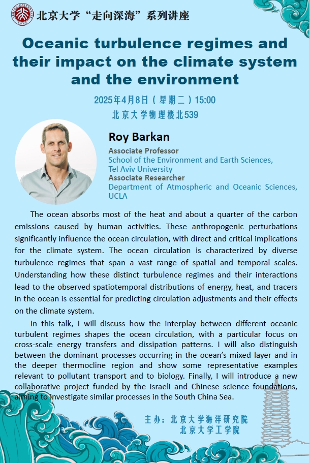 In this talk, I will discuss how the interplay between different oceanic turbulent regimes shapes the ocean circulation, with a particular focus on cross-scale energy transfers and dissipation patterns. I will also distinguish between the dominant processes occurring in the ocean’s mixed layer and in the deeper thermocline region and show some representative examples relevant to pollutant transport and to biology. Finally, I will introduce a new collaborative project funded by the Israeli and Chinese science foundations, aiming to investigate similar processes in the South China Sea.