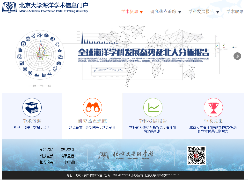 为支持海洋院系建设,促进海洋学科的发展,北京大学图书馆新建了海洋学术信息门户。门户整合了各类海洋学术资源、学科资讯、学科研究热点和发展报告以及自有学术成果,将全面提升海洋学术研究展现力及增强海洋学科的凝聚力。