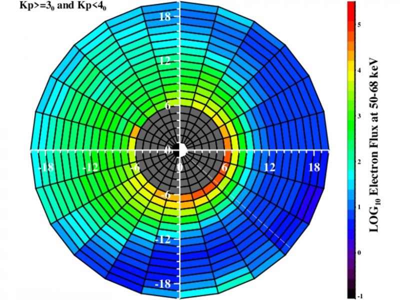 An equatorial-plane map of flux of ~60 keV electrons during moderate levels of geomagnetic activity. Earth is at the center of the map, with the white semi-circle indicating the sunlit side. The model covers the region where measurements are less routine, from about six Earth radii (RE) outward to 20 RE. The gray zone is not part of the study. Orange and red colors indicate relatively high electron fluxes. The color bar is on a logarithmic scale covering six orders of magnitude. Credit: Denton et al. [2019], Figure 5 top right panel