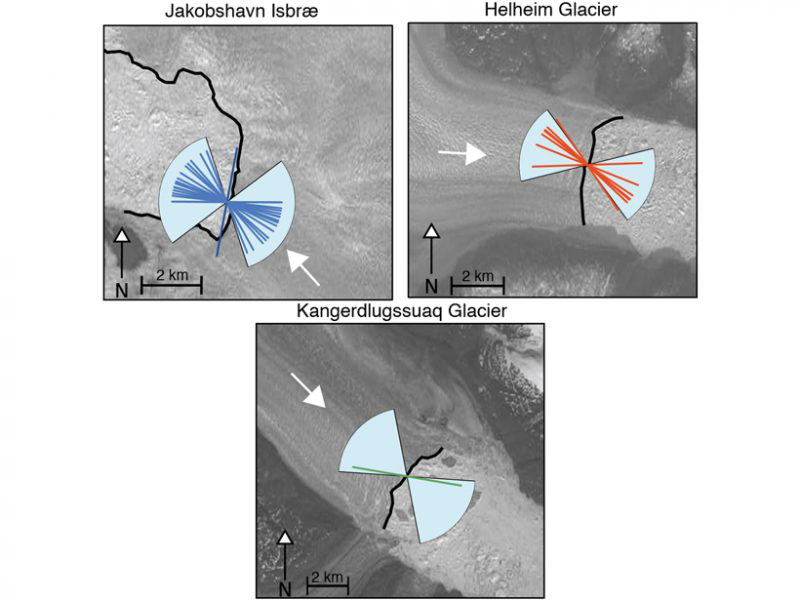 The three glaciers investigated in this study flow in the direction of the white arrow and terminate at the black line in each panel. 95% of all glacial earthquakes at each glacier have force-azimuth orientations within the blue wedges; the colored line segments show force orientations for the seismic events measured in this study. Credit: Olsen and Nettles [2019], Figure 7