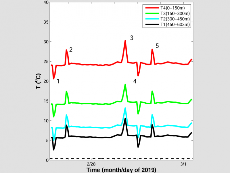 Time series of temperatures in four different depth layers (see inset legend) show the rapid (hours) and large (3°-5°C) changes from three warm (labelled 2,3,5) and two cool (1,4) temperature peaks associated with the passage of internal solitary waves inferred from coastal acoustic tomography (CAT) observations in Lombok Strait, Indonesia. Credit: Syasmudin et al. [2019], Figure 4a, lower panel
