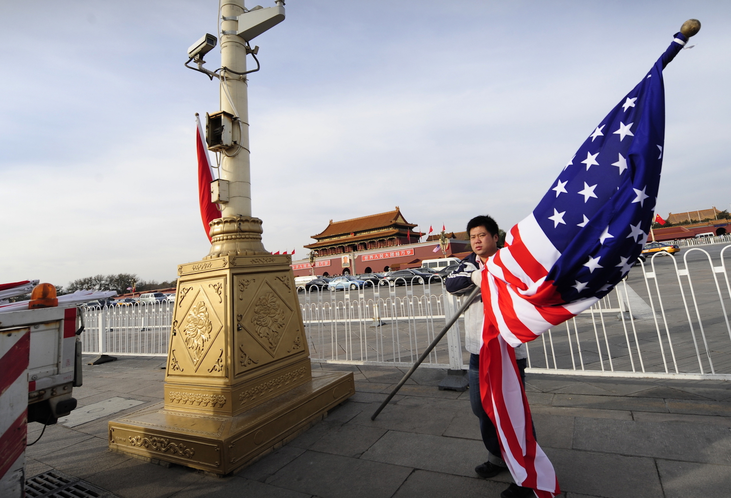 A worker holds a U.S. flag on Tiananmen Square in Beijing ahead of a visit by U.S. President Barack Obama on Nov.16, 2009.