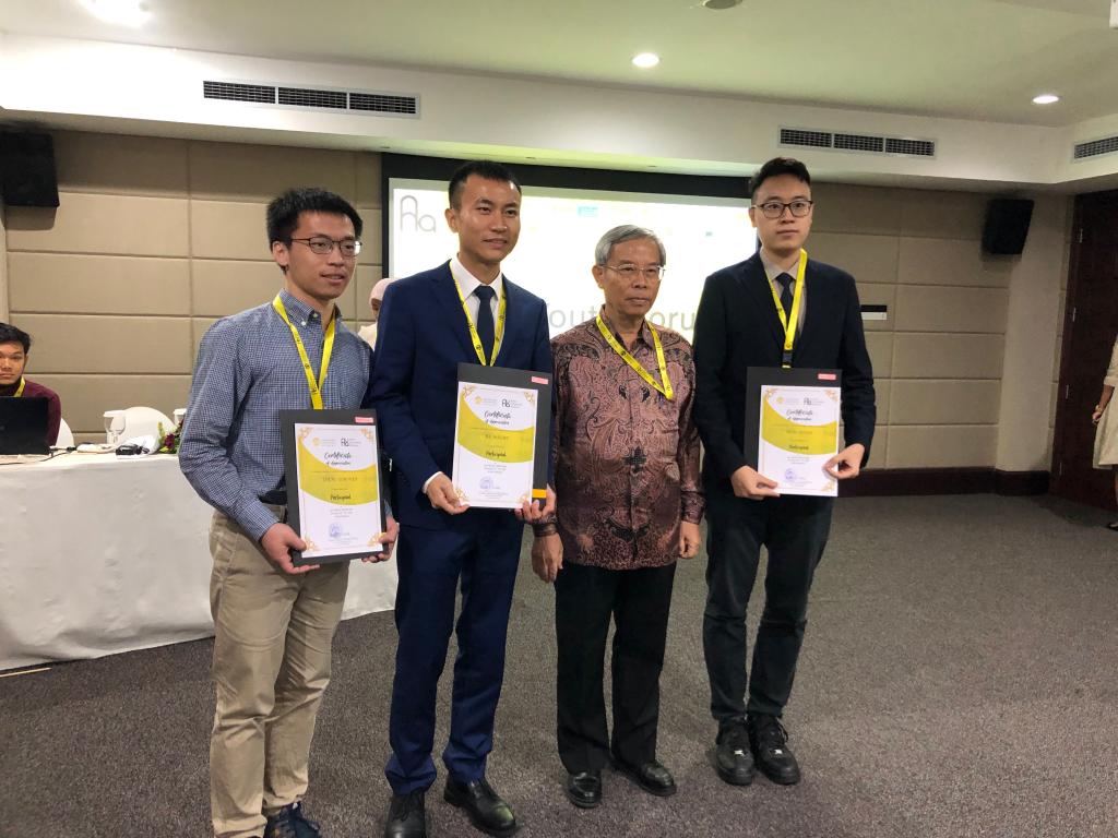 Ir. Sunaryo, Head of Indonesian University Maritime Center (IMC) issued a certificate of completion for each student, from left to right: Zheng Xingwen, He Yongjie, Wang Jiteng.